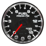 Autometer Spek-Pro Gauge Fuel Press 2 1/16in 15psi Stepper Motor W/Peak & Warn Blk/Chrm