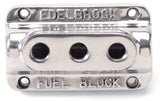 Edelbrock part #12851 Vintage Polished Aluminum Fuel Block for triple carb applications is a great way to finish off your fuel system in your hot rod or custom vehicle. The Edelbrock vintage polished aluminum fuel block for triple carb applications features a single 3/8" NPT inlet and three 1/4" NPT outlets. Each fuel block has four holes for mounting to a fire wall and has a polished aluminum finish.