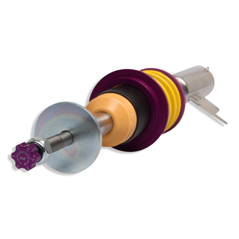 Cutting-edge motorsports technology for more performance on the road. Like every suspension product developed by KW automotive, the suspension manufacturer, and manufactured in Germany, the KW V3 Coilover suspension kit also provides a significant plus in safety reserves in road traffic. Thanks to the chassis with its high-quality dampers, springs, and elastomer spring elements, pitching and rolling movements during load changes such as evasive maneuvers, cornering, acceleration, and braking are significantly reduced. The braking distances are also shortened. Thanks to improved support and feedback, drivers not only feel safer but driving in everyday life becomes even safer. With compression and rebound stage damping, that can be set separately and independently of each other, the damper setup can be customized to your personal driving preferences or vehicle changes such as weight, tire characteristics, or altered vehicle rigidity. True performance optimization is only possible with this unique, patented system. For example, this allows the compression damping force to be increased and get more grip from the tires, to improve cornering behavior and reduce squat without simultaneously altering the rebound stage damping which is optimally matched to the spring rate, a scenario which results in reduced grip and the associated loss of performance. The KW V3 coilover kit is the ideal tool for performance-oriented drivers and experienced tuning enthusiasts who place a strong emphasis on the overall performance of their suspension. The Variant 3 features patented TVR-A and TVC-A technology that provides separately adjustable rebound and compression damping. The extensive adjustment range of the independently configurable rebound and compression make it easy to directly influence the steering behavior, directional stability, grip and handling characteristics for confident and repeatable results at the limit of driving dynamics.